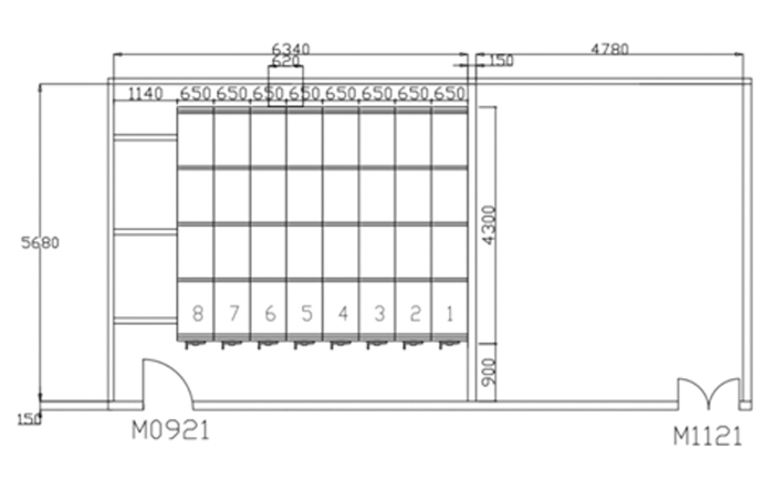 檔案室在三樓,通過現(xiàn)場(chǎng)測(cè)量,樓層的承重足夠, 唯一不足的是樓高只有2.2米?蛻粝M軌蜃畲蠡睦每臻g,擺放足夠多的檔案資料。本著合理保留工作空間的原則下,我司告訴用戶密集柜高度可以做到2米(五層)。且提交了如下平面圖設(shè)計(jì)稿:
